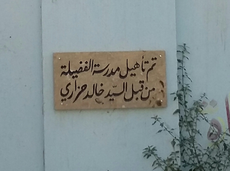 Plaque claiming credit for rehabilitation if Fadila school by Mr Khaled Hazari